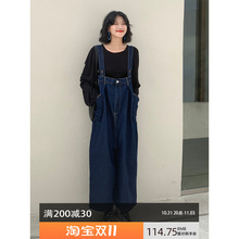 EM八月深蓝色牛仔背带裤春装2022年新款女小个子阔腿宽松牛仔裤