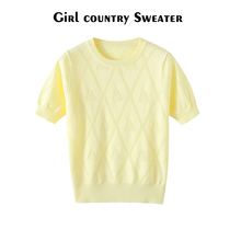 镂空钩花针织短袖女夏季新款修身冰丝T恤鹅黄色时尚收腰显瘦上衣