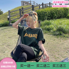瞌睡兔 正肩圆领T恤女夏季黄色休闲简约宽松显瘦字母印花短袖上衣