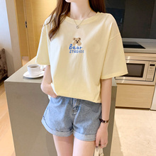 棉牵可爱卡通正肩短袖t恤女显瘦减龄学生复古纯棉半袖奶黄色上衣