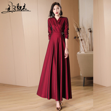 酒红色秋季连衣裙新款长袖收腰战袍长裙气质修身大摆裙到脚踝1628