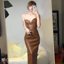 2022春夏新款PU皮棕色吊带连衣裙辣妹性感修身显瘦包臀开叉长裙潮¥59