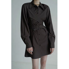 沫晗依美假两件衬衫撞色连衣裙2022秋季新款通勤系带设计收腰显瘦¥209.9