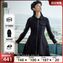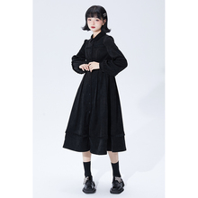 小葱良裁 黑色衬衫裙秋冬收腰中长款斜纹磨毛压褶花边长袖连衣裙¥269