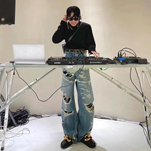 巴黎手工大破坏牛仔裤archive宽松舒适高街破洞拉丝做旧阔腿裤潮¥699