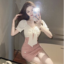 泡泡袖连衣裙女夏季性感V领低胸气质拼接撞色褶皱修身包臀短裙子¥55