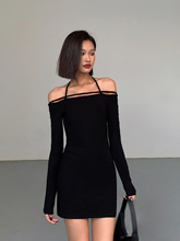 oushp 黑色一字肩挂脖连衣裙女2022秋季新款长袖修身气质包臀裙子¥108