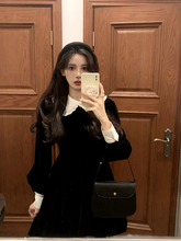 法式赫本风黑色连衣裙女2022新款秋娃娃领气质长袖金丝绒a字裙子¥188