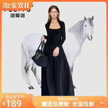 pusumede黑色方领长袖连衣裙女2022新款法式小众设计拼接长款裙子¥149