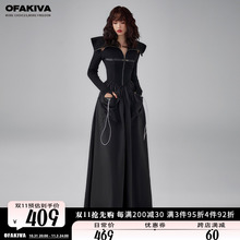 OfAkiva 黑色连衣裙女高腰修士翻领褶皱口袋设计针织拼接系带长裙¥469