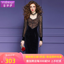菲梦伊黑色蕾丝丝绒连衣裙女长袖秋季法式气质性感开叉长裙子礼服¥398