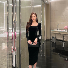 黑色金丝绒连衣裙女2022秋季新款方领法式赫本风气质显瘦长袖长裙¥188