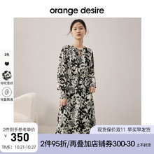 orange desire长袖印花连衣裙女2022秋冬新款法式v领裙子气质收腰¥399.99
