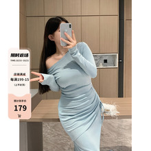 乌77高ji感灰色连衣裙女气质方领露锁骨修身显瘦别致惊yan长裙新¥99.9