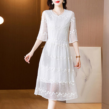 杭州丝绸刺绣白色真丝连衣裙女2022年新款中年妈妈夏装桑蚕丝长裙¥699