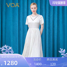 VOA丝绸弹力缎白色圆领短袖网格装饰风琴褶撞色爽滑桑蚕丝连衣裙¥1400