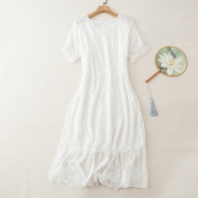 重工刺绣文艺仙气纯洁白色桑蚕丝圆领短袖真丝顺纡乔其连衣裙长裙¥146